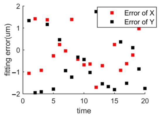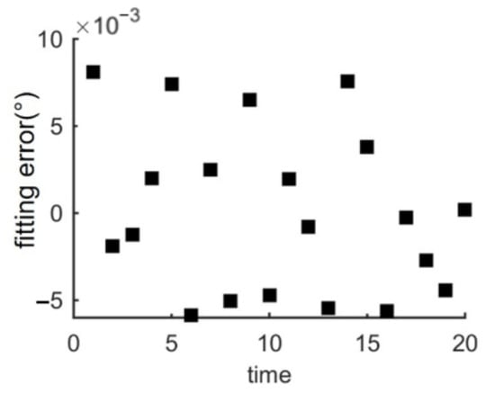 In Formula (3), , and are constants. Additionally, is the deviation in the direction, is the deviation in the direction and is the radius of the fitting circle. If there is an ideal curve that perfectly fits the data, is the fitting value. While we fit the data, we need to compare the difference between and the actual value . Therefore, the error Vi between fitting point and measuring point can be written in the form of the Fourier series
