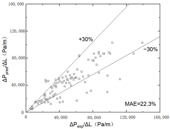The models of Mishima and Hibiki [], Lockhart and Martinelli [], Hwang and Kim [], and Zhang et al. [] overestimated the frictional multiplier. The models of Mishima and Hibiki [], Zhang et al. [], and Huang et al. [] share similar modalities. Huang et al. [] introduced a new parameter, named the superficial gas flux, to evaluate the overall effects of vapor quality and mass flux on two-phase frictional pressure drop in microchannels, with a mean absolute error of 47.5%. Among the existing correlations, Huang et al.’s correlation [] predicted the experimental data most accurately. The model of Mishima and Hibiki [], with a mean absolute error of 47.7%, applies only to mini-channel bubbly flow, while there are other flow patterns, such as slug flow and ring flow, in this experiment.