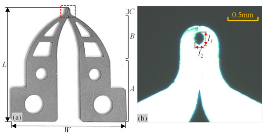 l2 are 0.20 mm and 0.14 mm, respectively. The microgripper adopts the processing technology of high-precision laser cutting, its material is 304 stainless steel, and the overall thickness is 0.20 mm. In addition, the system also includes a microvision system composed of two complementary metal oxide semiconductor (CMOS) cameras to detect electrode wires, as well as a five-axis motion control system. The sensors are used to measure eccentricity error as part of the final comparative experiment.