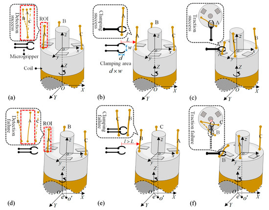 Figure 3d,e. Due to the existence of eccentricity, it will cause the electrode wire to deviate from the ROI for detection and result in a failure detection. The clamping area is tiny, and the change in the