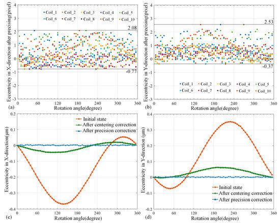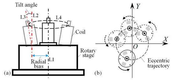 Figure 4a. The offset of the coil center line is relative to the ideal rotation axis, which generates a radial error. It also generates tilt error due to its tilt angle, which is caused by poor flatness of the base. They are the main eccentricity error sources in this system, and the coil’s eccentric trajectory is shown in