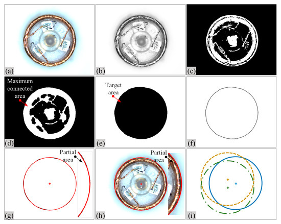 Figure 6g,h respectively show the results of edge contour fitting and circle feature extraction of the coil microscopic image. Among them, the partial area shows that the extracted circle had a high degree of fit with the actual outer circle of the coil.