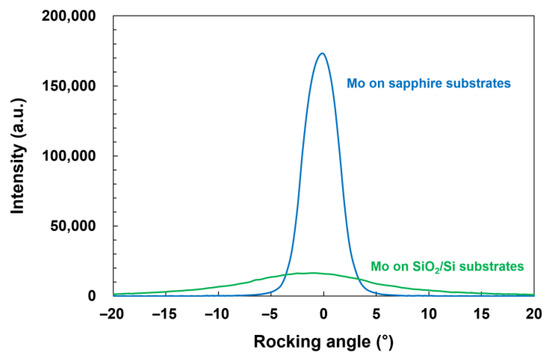 Further analyses of the crystalline quality of the (110)-oriented Mo crystals, which were found in both Mo thin films on sapphire and SiO2/Si substrates, were performed by XRD rocking curve measurements. The orientation distribution (mosaicity) of the (110)-oriented Mo crystals was obtained directly from the rocking curve. Figure 2 shows the rocking curve of Mo (110) reflection from the Mo thin films on sapphire substrates (blue). The rocking curve of Mo (110) for the Mo thin films on SiO2/Si substrates is also shown for comparison (green). The measured rocking curve for the Mo thin films on sapphire substrates showed a significantly stronger and sharper peak than that of the Mo thin films on SiO2/Si substrates. The calculated full width at half maximum (FWHM) values of the rocking curves for the Mo thin films on sapphire and SiO2/Si substrates were 3.1° and 12.7°, respectively, implying that the orientation degree of the (110)-oriented crystals on sapphire substrates was substantially higher than that of the (110)-oriented crystals on SiO2/Si substrates. The weak and broad peak exhibited by the Mo thin films on SiO2/Si substrates indicates that the (110)-oriented Mo crystals on SiO2/Si substrates were not well oriented and exhibited high mosaicity. These results suggest that the (110)-oriented Mo crystals on sapphire substrates with a higher crystalline quality are better templates for the growth of AlN thin films than the (110)-oriented Mo crystals on SiO2/Si substrates.