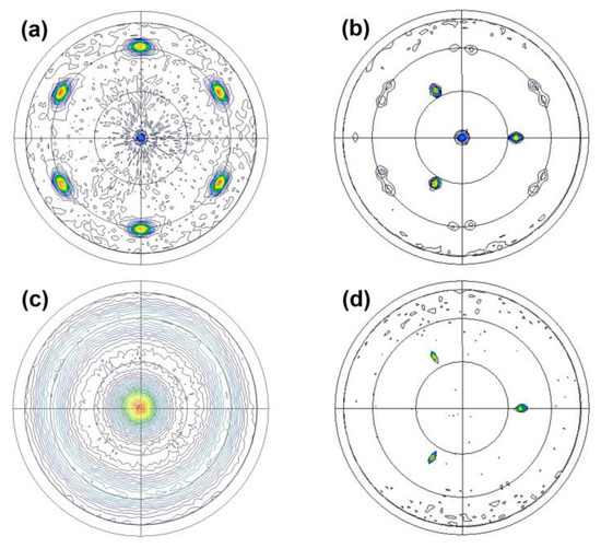 XRD pole figure of (a) AlN for the AlN thin films grown on Mo/sapphire (0001) substrates, (b) Mo (110) for the Mo thin films grown on sapphire (0001) substrates, (c) Mo (110) for the Mo thin films grown on SiO2/Si substrates, and (d) sapphire .
