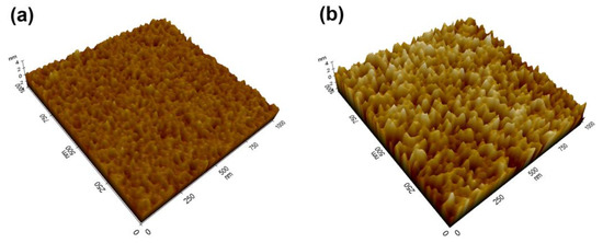 Figure 6a,b show the AFM images (1 µm × 1 µm) of the Mo thin films on sapphire and SiO2/Si substrates, respectively. The result reconfirmed that the surface morphology of the Mo thin films on sapphire substrates was uniform and smooth. The root mean square (RMS) roughness of the surface was measured to be 0.46 nm. However, as expected, the surface of the Mo thin films on SiO2/Si substrates was relatively non-uniform, and the RMS roughness was 1.1 nm, which was more than double that of the Mo thin films on sapphire substrates. These results are consistent with the findings from the SEM analysis and support the conclusion that the Mo thin films grown on sapphire substrates can serve as templates for the epitaxial growth of AlN thin films.