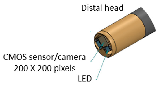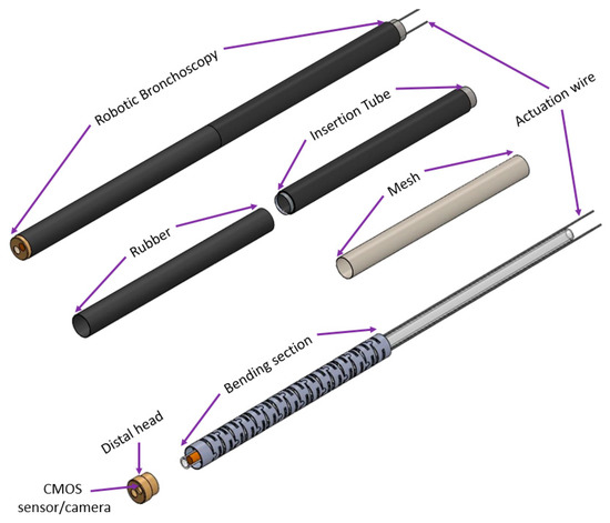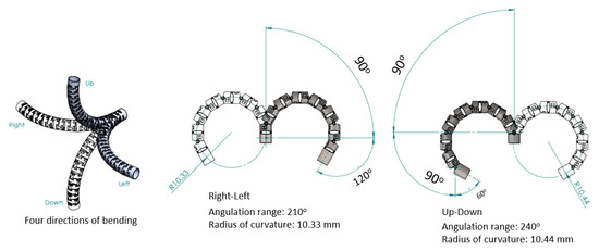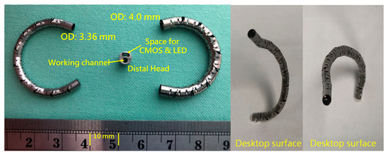 Based on the mechanical design described in Section 2.1, consecutive sub-sections of the bending section of the robotic bronchoscopy are manufactured by precise laser engraving of one piece of stainless-steel tube, of which the diameter can be selected to satisfy the size of the CMOS sensor/camera adopted. Four metal wires pass through the holes of each sub-section to actuate bending with any desired direction and angle. Figure 14 shows pictures of the bending sections with outer diameters of 3.36 mm and 4.0 mm, respectively, as well as the 3D orientation of this bending section. A CMOS sensor/camera (OV6948 with an optical size of 1/36″, 200 × 200 pixels, and 30 fps) is integrated into the distal head at the tip of the bending section. With reference to Figure 1, it displays the assembly of this robotic bronchoscopy. It shall be noted that SUS304 and SUS316L are applied as the materials of mechanical components to satisfy the FDA requirements for materials. Moreover, the overall manufacturing and assembly process will be GMP-certified. In addition, a gravitational indicator is added to our bronchoscopy implementation to indicate the horizontal level for determining the right or left side.