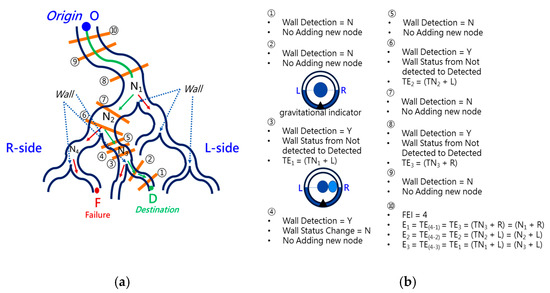 To navigate the robotic bronchoscopy when moving inside the bronchial tree by following the pre-determined path planning with planned and ordered Events, an algorithm of backward path planning was described in Section 2.3. Referring to Figure 7, which shows the proposed backward path planning, and Figure 8, which shows the simplified bronchial tree, as shown in Figure 16, an initialization image at Destination D is loaded, and at point ① according to the Node Determination, Wall Detection is NO. This leads to No New Node Added as shown in Figure 16. Based on the proposed backward path planning, the virtual tip of the robotic bronchoscopy is controlled to move backward from the Destination to the Origin while the corresponding medical images are loaded along with the backward moving path. Thus, at point ②, the same status is concluded: No New Node Added. At point ③, Wall Detection is YES and Wall Status is changed from Not detected to Detected. In addition, from the image history and 3D model of the bronchial tree reconstructed from medical images, a Right-Hole will appear on the right side once the tip has moved backward slightly from point ② to point ③, then a New Event with New Node and Decision () is added, as shown in Figure 16. In the following steps, the Decision corresponding to an Event is specified by the same scheme. At point ④, the Wall is still detected but Wall Status is not changed, and the planning result is No New Node Added. Meanwhile, at point ⑤, there is no Wall detected since the tip of the bronchoscopy is located far from the previous Wall. The planning result is No New Node Added. Meanwhile, at point ⑥, Wall Detection is YES and Wall Status is changed from Not detected to Detected, and then a New Event with a New Node and Decision ( is added. At point ⑦, the status is the same as at point ⑤, and No New Node is added. At point ⑧, accordingly, Wall Detection is YES and Wall Status is changed from Not detected to Detected, and then a New Event with a New Node and Decision ( is added. At point ⑨, the planning result is No New Node Added. Finally, at point ①, the Origin, the Final Event Index FEI is 4, and by applying Equation (5), a series of planned and ordered Events are listed, as shown in Table 3.