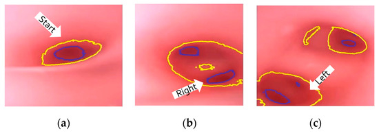 At the navigation stage, following the navigation algorithm described in Section 2.4 and as shown in Figure 9, by adopting image recognition to identify the Node, making a Decision at this Node, marking and recording that this Event has been triggered, and moving forward until the next Node is identified, the Destination will be reached. In Figure 17, the results of an experiment in the bronchial tree phantom with our proposed algorithms are illustrated. The correctness of image recognition can navigate the robotics bronchoscopy to move along the correct path. In Figure 17a, image recognition is illustrated as yellow and blue circles. During the insertion of the robotic bronchoscopy along the bronchi, a bifurcation is then detected, illustrated as two blue circles in Figure 17b. According to the first Event definition, Right Decision is selected as indicated in Figure 17b. Meanwhile, in Figure 17c,d, the Decisions of the second and third Events are Left and Left, respectively. This experiment demonstrates the feasibility of the proposed algorithms.