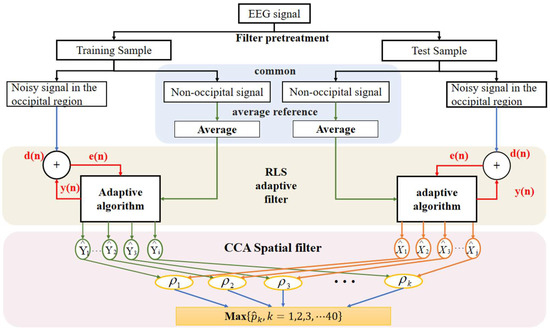 We use the RLS algorithm to calculate the actual output of the filter obtained from at time using exponential weighting. In practical experiments, represents the SSVEP signal with noise in the occipital region, represents the obtained nonoccipital mean signal, is the output noise signal, and is the pure SSVEP feature signal that is desired. The flow chart is shown in Figure 4.