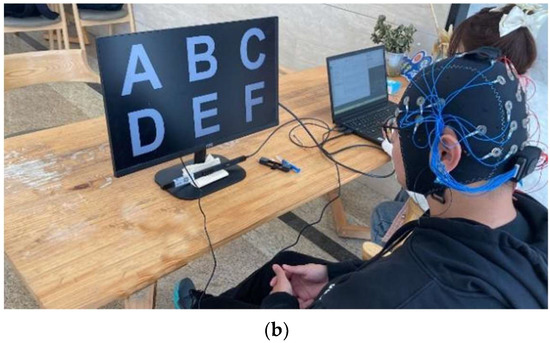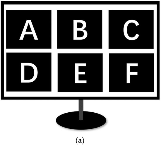 A brain–computer interface (BCI) aims to transform the activities of the central nervous system (CNS) into computer language. It enables information transmission between the human brain and computer without using other physiological organization structures [1,2,3]. At present, the brain–computer interfaces are mainly divided into invasive and noninvasive. In the invasive BCI, the microelectrode array is mainly implanted into the human brain [4], while in noninvasive BCI, electroencephalography (EEG) signals on the scalp surface are mainly recorded [5,6]. Visual evoked potentials are electrical activities in the visual cortex caused by external visual stimuli. Regan [7] first published his pioneering work on visual evoked potentials in 1979. Subsequent studies found that when subjects were stimulated with a fixed frequency flicker, the visual cortex would generate EEG signals modulated by the frequency of the stimulation [8]. Studies have shown that when the human gazes at a periodic visual flicker stimulus with a frequency greater than 4 Hz, a periodic response EEG is generated in the brain. Such EEG signals, modulated significantly by the frequency of stimulation, are known as steady-state visual evoked potentials (SSVEPs) [9]. The common SSVEP BCI system judges the screen position of the subject’s gaze through the frequency information carried by the SSVEP. It has stable spectrum and high signal-to-noise ratio [10,11]. SSVEP relies on a steady stream of visual stimuli. However, a flashing stimulus lasts too long and tends to cause visual fatigue, and even epilepsy in severe cases. There are several factors that affect the performance of an SSVEP BCI system, including the size of the SSVEP signal detection area [12,13], different stimulus paradigm selection and optimization parameter methods, stimulus paradigm coding paradigm [14], whether advanced neural network techniques are used in identifying signals [15,16], and whether efficient filtering and classification algorithms are used [17,18,19,20].