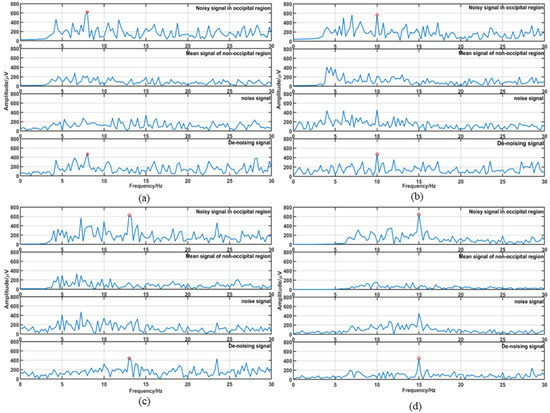 Figure 8 shows the RLS filtered frequency domain waveform of four subjects and the time domain waveform of subject no. 1. The following four images show all waveforms for subject gazing at 8 Hz (a), 10 Hz (b), 13 Hz (c), and 15 Hz (d) targets. The red circles marked the characteristic frequency of SSVEP. Figure 8e shows the time domain plot corresponding to Figure 8a. The four columns from top to bottom correspond to the input occipital signal, nonoccipital signal, noise signal, and denoised signal. In the frequency domain image, the noninduced SSVEP signal filtering is significant, and the relative amplitude of the induced SSVEP component increases.