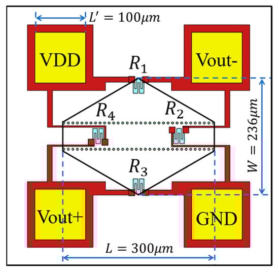 The black hexagonal solid line in Figure 2 represents the profile of our fabricated pressure-sensing diaphragm. In order to further reduce the chip size, the pads with a length of 100 μm are located on the place where is as close as possible to the pressure-sensing diaphragm. In addition, considering that heavily boron-doped silicon layer as trace line on the pressure-sensing diaphragm will introduce significant residual stress, and weighing the pros and cons, we use metal trace line instead of heavily boron-doped silicon layer to interconnect the piezoresistors to form a Wheatstone bridge. Attributed to the layout of the piezoresistors interconnected with uniform and symmetrical Ti/Pt/Au-trace line, the thermal hysteresis of output voltage can be effectively reduced [].