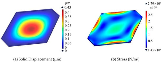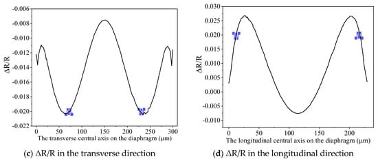 After theoretic analysis according to the design rules in [] and our previous works in [], the dimensions of the hexagonal-shaped pressure-sensing diaphragm with the length of 300 μm along the horizontal symmetry and the width of 236 μm along the vertical symmetry in Figure 2 is designed, and the four Wheatstone-bridge piezoresistors are laid at the locations with maximum piezoresistive sensitivity. With applied pressure on the sensitive diaphragm, and are subjected to tensile stress, resulting in an increase in their resistance value, whereas and will decrease their resistance value. The four piezoresistors form a fully sensitive Wheatstone bridge. Additionally, a finite-element analysis by using COMSOL was implemented on the flat hexagonal-shaped pressure-sensing diaphragm with area of 42,900 μm2 and thickness of 8 μm to evaluate the rationality of the abovementioned design (e.g., piezoresistor arrangement and measuring range). Under an applied pressure of 1.5 MPa from the top side of the diaphragm, the COMSOL-simulated results in Figure 3a show that the maximum deflection of 0.43 μm at the center of the pressure-sensing diaphragm is far less than one fifth of the thickness of the sensitive diaphragm [], satisfying the small deflection deformation of the sensitive diaphragm within the full range of 1.5 MPa, which is helpful in achieving a low non-linearity. As is depicted in Figure 3b, the maximum von Mises stress of N/m2 occurs at the edge of the diaphragm, which is smaller than silicon rupture stress ( N/m2) [], ensuring the sensor will not be damaged under 10 times of overload pressure. In addition, the rate of the stress-induced resistance change, ΔR/R, in Figure 3c,d can be derived from the stress distribution along the longitudinal direction and the transverse direction, respectively. As shown in Figure 3c,d, in order to achieve both high sensitivity and high output linearity, the four piezoresistors are placed at the locations where the transverse and longitudinal resistance relative change, ΔR/R, have the same value and ≥2%. Referring to the layout of the piezoresistors, the theoretical sensitivity of the pressure sensor is approximately 0.013 mV/V/kPa.
