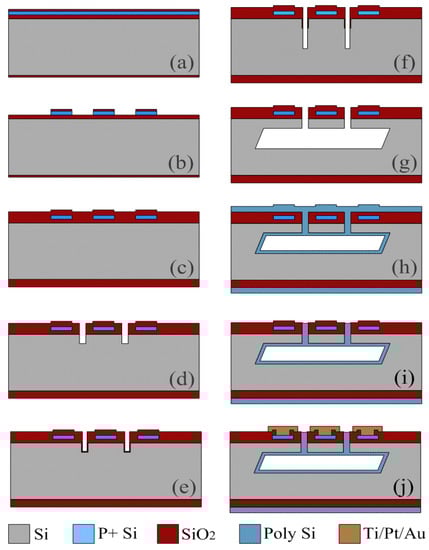 (j) An Ti/Pt/Au film is sputtered, patterned and sintered for the electrical interconnection of the Wheatstone bridges and the wire bonding.