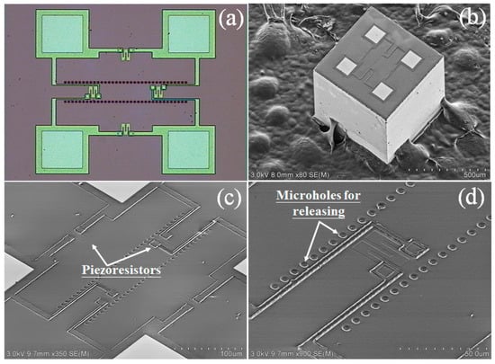 (a) Optical and (b) SEM images of the pressure sensor chip. (c) Magnified view of the piezoresistors; (d) Magnified view of the microholes that have been sealed later.