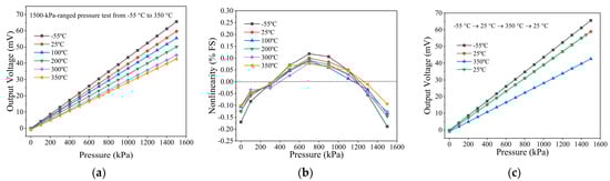 (a) The 1.5 MPa ranged pressure test from −55 °C to 350 °C. (b) The tested non-linearity and (c) the tested thermal hysteresis of the pressure sensor within the temperature range from −55 °C to 350 °C.