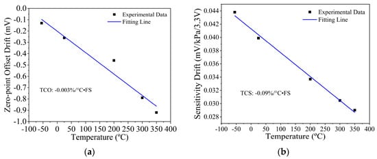 (a) Tested zero-point temperature drift and (b) sensitivity temperature drift within the whole temperature range of −55 °C to 350 °C.