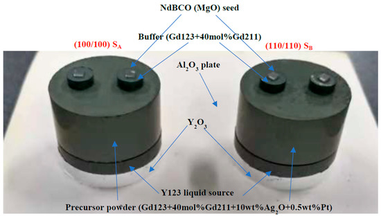 The pressed pellets were assembled in order from top to bottom: NdBCO seed crystals, buffers, precursor, Y123 liquid source, Y2O3 and aluminum oxide plate. A Y2O3 cylindrical pellet with equal diameter was inserted between the Al2O3 plate and the Y123 pellet to prevent a reaction between them. As shown in Figure 1, two NdBCO seed crystals were arranged in two different ways: (100/100), and (110/110), named SA and SB. The distance between the two seed crystals (the linear distance between the center of the seed crystal) was 12 mm.