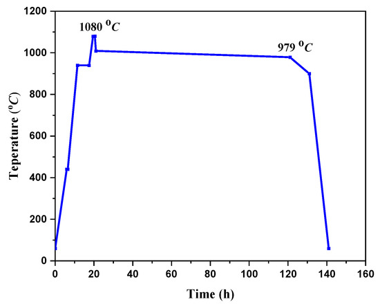 The assembled pellet was placed into a box furnace for sintering, and the temperature was raised to 1080 °C at a rate of 50 °C/h, held for 1 h, quickly cooled to 1009 °C, and then slowly cooled to 979 °C at a rate of 0.3 °C/h. Finally, it was cooled to room temperature with the furnace, as shown in Figure 2. In order to obtain the orthogonal superconducting phase structure, annealing treatment was carried out in a flowing high-purity oxygen atmosphere. SA and SB were heated to 450 °C within 5 h, kept for 40 h, and then cooled to 350 °C within 40 h and 300 °C within 30 h, respectively. In the end, they were naturally cooled to room temperature. Then, two GdBCO bulks with high performance were fabricated successfully.