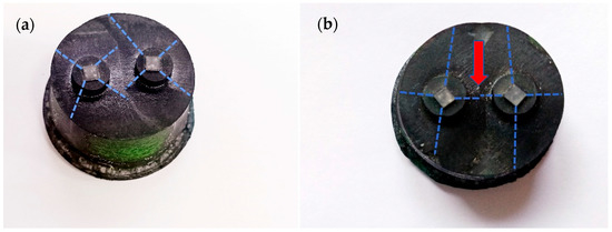 The macromorphology of SA and SB is shown in Figure 3. The growth facet line of the seed crystal is marked with a blue dotted line in the picture. It can be seen that the seeds were intact, and there was no melting phenomenon. There was an obvious drift phenomenon between the two seed crystals of SA, and the two seed crystals of SB were arranged relatively orderly, but there was still a slight drift phenomenon (indicated by the red arrow). From the top views, we can clearly see the grain boundary. The appearance of grain boundaries is inevitable in the growth process, so we need to reduce the negative impact of grain boundaries on the superconductor bulk. Many factors affect the grain boundary. Theoretically, the factors affecting grain boundary depth are the distance between seed crystals. The arrangement of the seed crystals and the buffer layer and the size of the buffer layer are also important factors when using the buffer layer. The depth of the grain boundary increases with the increase of the distance between seed crystals for the growth of the multiseeded bulk. The depth of the grain boundary of multiseeded bulks is mainly determined by the angle [33] formed by the top surface and the boundary of the a and c growth region. The way to change this angle is to increase or reduce the distance between the seed crystals. The larger the angle, the deeper the grain boundary is formed, indicating that the distance between the seed crystals is farther. The smaller the angle, the shallower the grain boundary formed, indicating that the distance between the seed crystals is closer. The seed crystal and the buffer layer can effectively induce growth as a large-size seed when the buffer layer is added, reduce the effective length between the seed crystals significantly, reduce the a-sector growth area and increase the c-sector growth area. Then, the angle formed between the top surface and the boundary of the a-sector and c-sector growth area is reduced so as to decrease the depth of the grain boundary, which improves the superconducting properties [17,34,35,36].