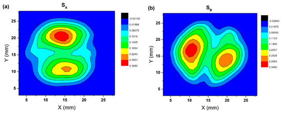 Figure 4 shows the distribution of trapped magnetic flux density on the top surface of two bulks measured in a liquid nitrogen environment (3D map and 2D map). It can be seen from the picture that the magnetic flux distribution of the two bulks is conical and shows two peaks. The two peaks of SA were 0.30 T and 0.23 T, and the two peaks of SB were 0.35 T and 0.29 T, respectively. SB had a smaller difference between the two peaks and showed a higher peak compared with SA. It can be observed in (a) and (b) of Figure 4 that the two growth regions were not symmetrical, and the nucleation particles guided by one seed crystal were significantly better than the other. This phenomenon may be caused by the different nucleation times of two seed crystals, the different temperatures at the different positions of the seed crystals, or the asymmetric arrangement of two-seeded crystals, which should occur randomly [28].