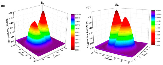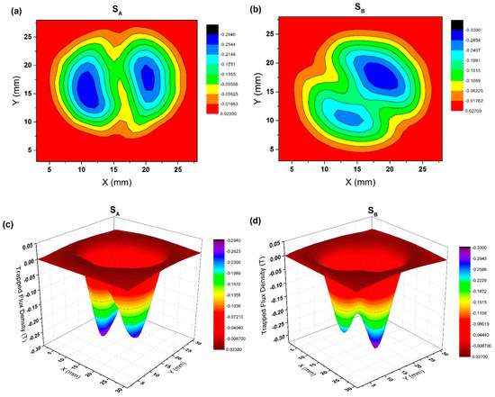 The top surface trapped field (3D map and 2D map) of SA and SB measured in a liquid nitrogen atmosphere, (a) 2D map of SA; (b) 2D map of SB; (c) 3D map of SA; (d) 3D map of SB, respectively.