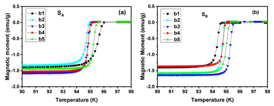 Figure 6 shows the temperature dependence of the magnetization of specimens b1, b2, b3, b4 and b5 cut below the seed crystals of SA and SB. The curves in Figure 6a,b show that the values of initial transition temperature TC, onset is between 94~96 K with the superior superconducting properties. On the whole, the transition width of SA changes greatly, which is not as sharp as SB. The distribution of TC, onset of SA was relatively concentrated, showing a large transition width at position b1, while it was relatively narrow at the other positions. The distribution of TC, onset of SB was relatively scattered, but the transition width of all specimens was very sharp except b1, and the value of transition width was about 0.5 K. Among them, the TC, onset of position b1 was the lowest, and the TC, onset of position b3 was the highest. This suggests that the transition width of TC in specimen b1 near the seed crystals slightly increases due to the substitution of Gd/Ba ions [25,31]. We infer that the addition of two independent buffer layers has no adverse effect on the superconducting properties of GdBCO bulks.