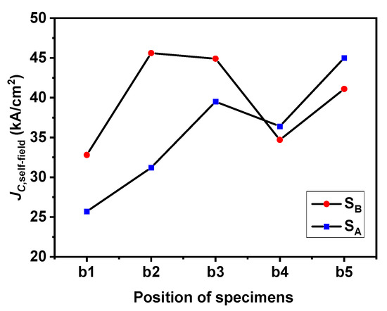 Figure 7 shows the critical current density curve of specimens b1, b2, b3, b4 and b5 under SA and SB seed crystals. For convenience in the analysis, the self-field JC values of the specimens at different positions are plotted in Figure 8. The JC curve results of SA showed that under the applied magnetic field, the JC, self-field value of the specimens had different trends. Specimen b5 at the bottom had the highest JC, self-field under the low field and was lower than b3 under the middle field. Its highest JC, self-field value was 4.5 × 104 A/cm2. The JC curve results of SB showed that under the applied magnetic field, the JC, self-field of the specimens changed with the increase in the distance from the seed crystal in the c-axis direction, increased from position b1 to b3, and was higher than the value of SA at the corresponding position, but the values of positions b4 and b5 were slightly lower than that of SA. The maximum JC, self-field value of specimen b2 was 4.56 × 104 A/cm2, which is comparable to the results of GdBCO superconductor bulks [25,29]. SB maintained absolute advantages in low magnetic field, medium magnetic field and high magnetic field. The JC value of the bottom specimens of the bulks was very high, which may have been due to the introduction of a Y123- rich liquid phase, which plays a positive role in filling the defects in the microstructure completely and improving the uniformity of superconducting phase particle distribution [39], consistent with the results in trapped fields.