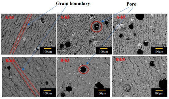 Figure 9 is a set of scanning electron microscope (SEM) photographs of specimens b1, b3 and b5 of SA (100/100) and SB (110/110) at 500 times magnification. The pore distribution in the pictures showed typical characteristics, which changed with the distance from the seed crystal. The existence of these pores was mainly due to the precipitation of the gas in the melting process, which were trapped in the melt and forms circular pores. The distribution trend of the pores of two bulks in b1, b3 and b5 was consistent. The number and size of pores at b1 were small, and the number and size of pores at b3 and b5 were large. Compared with that in SA, the grain boundary was narrow and the amount of residual melt at the grain boundary was small in SB specimens, which was related to the high trapped field in SB, as shown in Figure 4 and Figure 5. The pore distribution of SA showed that the number of pores in the bottom was higher than that in the middle, and the middle was higher than that in the top. The pore distribution of SB showed that the number in the middle was higher than that in the bottom, and the number in the bottom was higher than that in the top position. Overall, the number of pores in SA was significantly higher than that in SB.