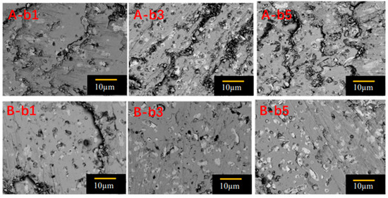 Scanning electron microscope photos of 5000 times magnification of cut specimens of SA (100/100) and SB (110/110) at positions b1, b3 and b5.