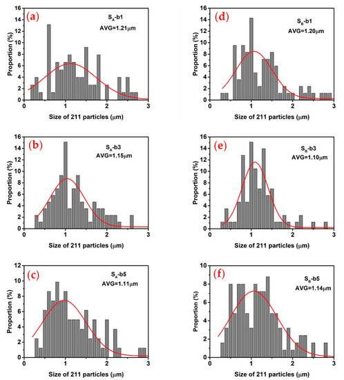 The size distribution of the Gd211 particles in the GdBCO superconductor bulks at positions b1, b3 and b5. The red solid curves represent the fitted curves obtained by fitting the size distribution of the Gd211 particles. The average size values of the Gd211 particles (AVG) obtained from the peak position of each fitted curve are also given, (a) SA-b1; (b) SA-b3; (c) SA-b5; (d) SB-b1; (e) SB-b3; (f) SB-b5, respectively.