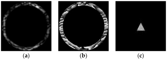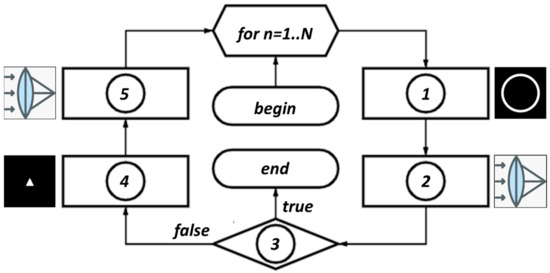 The iterative algorithm presented in Figure 1 consists of the following main blocks: truncation of the complex field in the spectral plane by an annular diaphragm, modeling, action of the lens using the Fourier transform and replacement of the intensity by given one in the focal plane. The stopping criterion for the iterative algorithm is determined by the root mean square error (RMSE) of the generated intensity distribution from the given (primitive) picture. When the RMSE falls below the specified threshold MSE0, the calculation is finished. Figure 2 presents a block diagram of an iterative algorithm for the formation of a diffraction-free structured laser beam with a transverse intensity distribution in the form of a given primitive (in particular, “triangle”). The iterative process is described in more detail below.
