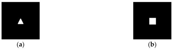 This section presents the results of calculating the complex transmission function using the iterative algorithm described in Section 2.1 with the aim of forming various primitive diffraction-free distributions D(u,v), for example, a triangle and a square (Figure 3).