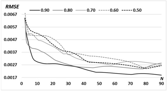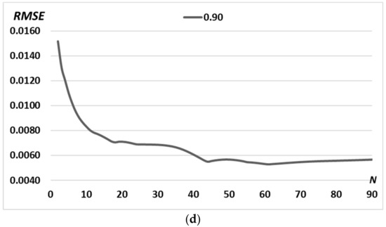 RMSE for the formed intensity distribution from the given (“triangle”-type primitive) for the N = 90 iterations with a variable middle radius of the ring d: 0.90 R0; 0.80 R0; 0.70 R0; 0.60 R0; 0.50 R0 (R0 is defined in Section 2.1).