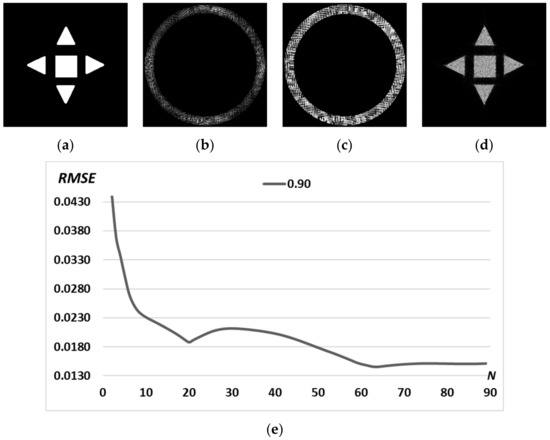 Picture “sign” (a); amplitude (b) and phase (c) of the generating field and the corresponding transverse intensity distribution in the focal plane (d). Graph of RMSE versus the number of iterations (e).