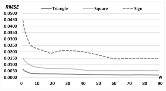 RMSE of the generated intensity distribution for “triangle” (dark solid line) and “square” (light solid line) primitives and for complex “sign” picture (dashed line) for N = 90 iterations with a fixed middle radius of the ring d = 0.90 R0.