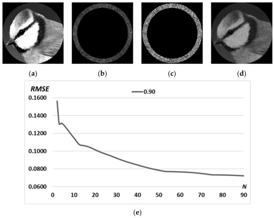 Complex pattern D(u,v) according to the grayscale image “bird” (a); amplitude (b) and phase (c) of the calculated DOE and corresponding transverse intensity distribution in the focal plane (d). Graph of RMSE versus the number of iterations (e).