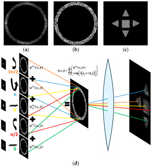 Obviously, we can compose the multi-channel DOE calculated by Equation (12) from different types of primitives. Figure 12 shows the multi-channel DOE matched with one “square”-type primitive at the central part and four a “triangle”-type primitives rotated by angles φ0p = πp/2 and shifted from the central part. Figure 12d presents the synthesis scheme for such multi-channel DOE in detail.