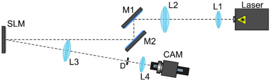 For the experimental investigation of the designed DOEs, the optical scheme based on a reflective spatial light modulator (SLM) HOLOEYE PLUTO VIS (1920×1080 pixels, pixel size of 8 μm) was used (see Figure 14).