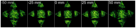We expect that the generated diffraction-free beam retains its structure also after the focal plane. The RMSE between the intensity distribution at the focal plane and the intensity distribution defocused at 75 mm distance (after focus) does not exceed 0.06. The calculation results for the generated diffraction-free beam at defocus distance z in the range from −75 mm to 75 mm are presented in Figure 13.