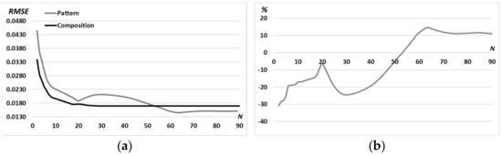 Comparison of the RMSE for the “sign”-pattern (referred to as “pattern”) and the superposition of primitives composed as “sign”-picture (referred to as “composition”) (a) and difference in percentage (b) for N = 90 iterations with a fixed middle ring radius d = 0.9R0.