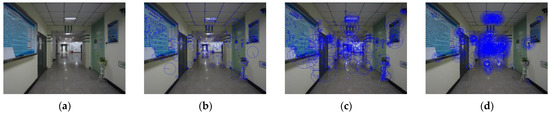 The corridor in the building was narrow in scene Ⅰ; hence, the square hall in scene Ⅱ was selected as the main test site. Data were collected from five effective shooting directions of 32 test points in this corridor. Considering that the width of the corridor in the actual scene and the positioning performance to be verified need to ensure the diversity of poses, the center line of the corridor was selected as the central axis of the test point in scene Ⅱ, which was expanded at an interval of 0.6 m. The 24 sampling points covered all eight representative directions for image shooting. In order to verify the comprehensive positioning effect and accuracy, scene Ⅱ was taken as an example of the subsequent positioning experiment.