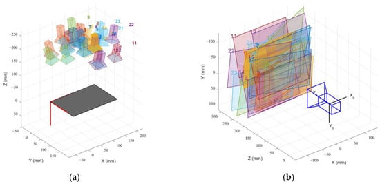 , there were 56 groups of experimental data in total. The above verification was carried out on the images of the six points and eight directions; thus, 6 × 56 × 8 = 2688 positioning results were obtained. The 2D and 3D positioning results are shown in