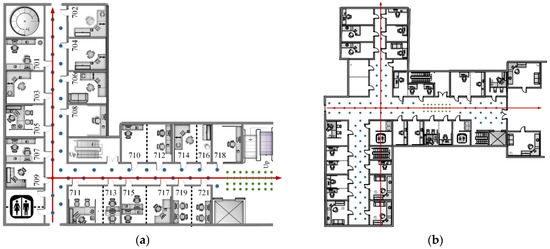 Figure 17, although the overall structure of the building presents a symmetrical distribution, the external outline is irregular, and the layout of the rooms in the building is also crisscrossed. The corridors, stairwells, and passageways between the buildings are intricate. Therefore, it is necessary to conduct indoor positioning for this kind of environment.