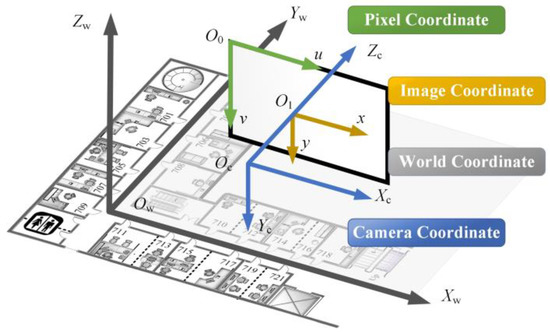 12] took a depth camera as the carrier to acquire indoor color and depth images, and then built a visual positioning framework on the basis of image features and depth information. The binocular camera can obtain the depth data of target points according to the focal length, baseline, and parallax matrix. However, depth and binocular cameras are expensive, significantly reducing their ease of use and universality. With the popularity of smartphone terminals and the reduction in the cost of vision sensors, indoor visual positioning based on monocular images has broader application prospects.