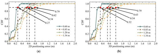 Figure 23. The cumulative distribution trend of positioning errors in all directions was consistent, indicating that the positioning method was not limited to a specific pose. The 2D positioning error and the 3D positioning error showed a uniform trend. Specifically, 90% of the 3D positioning errors were within 0.58 m, verifying the method’s robustness under different poses and meeting the positioning accuracy requirements in practical applications.