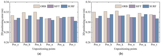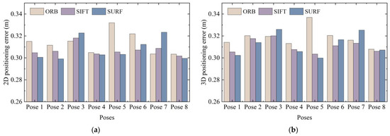 We compared the CDF of positioning error of different pose images and different feature extraction methods. The average positioning error was sorted out to further observe the errors clearly. The average 3D positioning error of the 2688 data obtained using the ORB, SIFT, and SURF methods was 0.3186, 0.3106, and 0.3121 m, respectively. The 2D and 3D average positioning errors of different poses and different positioning points are shown in
