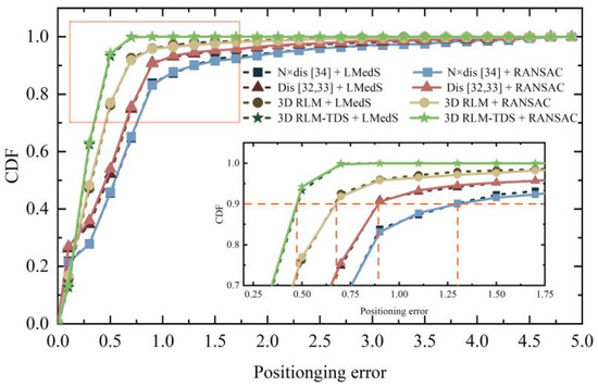 In order to verify that the positioning method proposed in this paper could achieve a higher positioning accuracy, the conditions that led the positioning accuracy to present the lowest state were selected in the subsequent positioning experiments. That is to say, the image retrieval range was eight points around the node to be located, and the distance between the retrieval result and the point to be located was 0.85 m. If, under these conditions, 3D RLM-TDS can resist the influence of the two conditions to be verified and present stable positioning accuracy, then it can achieve higher localization accuracy when the retrieval results show the other three groups in better states.