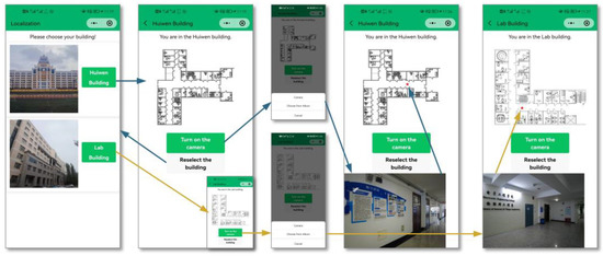 Figure 29. The instruction to retrieve corresponding dataset by SURF is sent according to the building selected by the user. Photos chosen from albums or taken by users are compressed and uploaded to obtain poses by RANSAC. Lastly, the adjusted coordinates calculated by 3D RLM-TDS are transmitted to the mini program for marking.