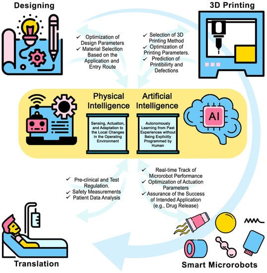 27]. Machine learning (ML) is a subfield of AI that focuses on leveraging data and algorithms to mimic human learning. ML can be utilized in a wide variety of sectors such as defect detection in manufacturing processes, sale forecasting in marketing and commercialization steps, and patient data analysis in clinical administration. AI and physical intelligence (PI) can be integrated with microrobots for development of advanced healthcare systems (